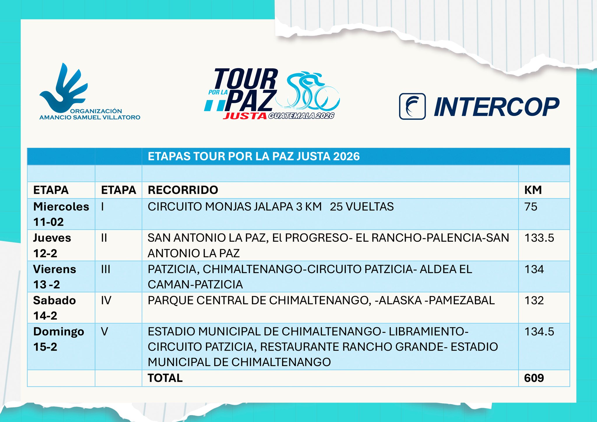 Los seis ciclistas ticos afrontarán 609 kilómetros en cinco etapas iniciando con un circuito de tres vueltas en Mojas, Jalapa y finalizará con una etapa en línea con salida y llegada en el Estadio Municipal de Chimaltenango, que incluye un circuito en Patzicía. La etapa reina será la número cuatro con el paso por el puerto de Alaska (3.000 msnm), antes del remate en Pamezabal.