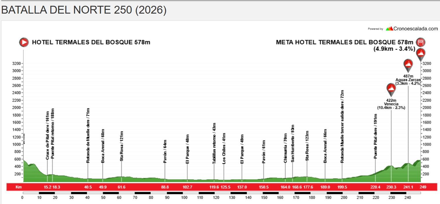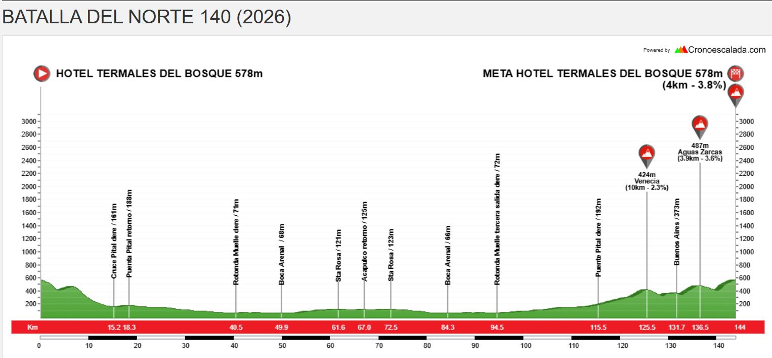 Batalla del Norte (141 km): Termales del Bosque – Puente Pital retorno – Santa Rosa de Pocosol retorno – Cruce de Muelle – Cruce La Tabla – Venecia – Termales del Bosque.