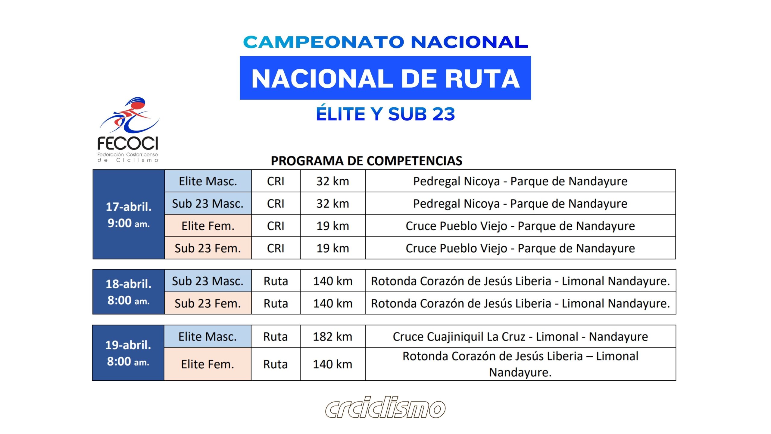El cronograma de competencia iniciará el viernes 17 de abril con las pruebas frente al cronómetro, con 19 kilómetros para la rama femenina entre el cruce Pueblo Viejo y el Parque de Nandayure, mientras que la rama masculina recorrerá una distancia de 32 kilómetros entre Pedregal de Nicoya y el Parque de Nandayure. Será  una jornada sumamente rápida tendiendo al descenso en los primeros 10 kilómetros.